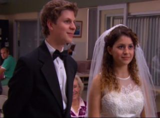 - Arrested Development: Season 3, episode 10, "Fakin' It" (2006). Maeby and George Michael act out a pretend wedding for the elderly patients at the hospital, but a mix-up causes a real priest to step in for the pretend priest, and he ends up marrying them for real.